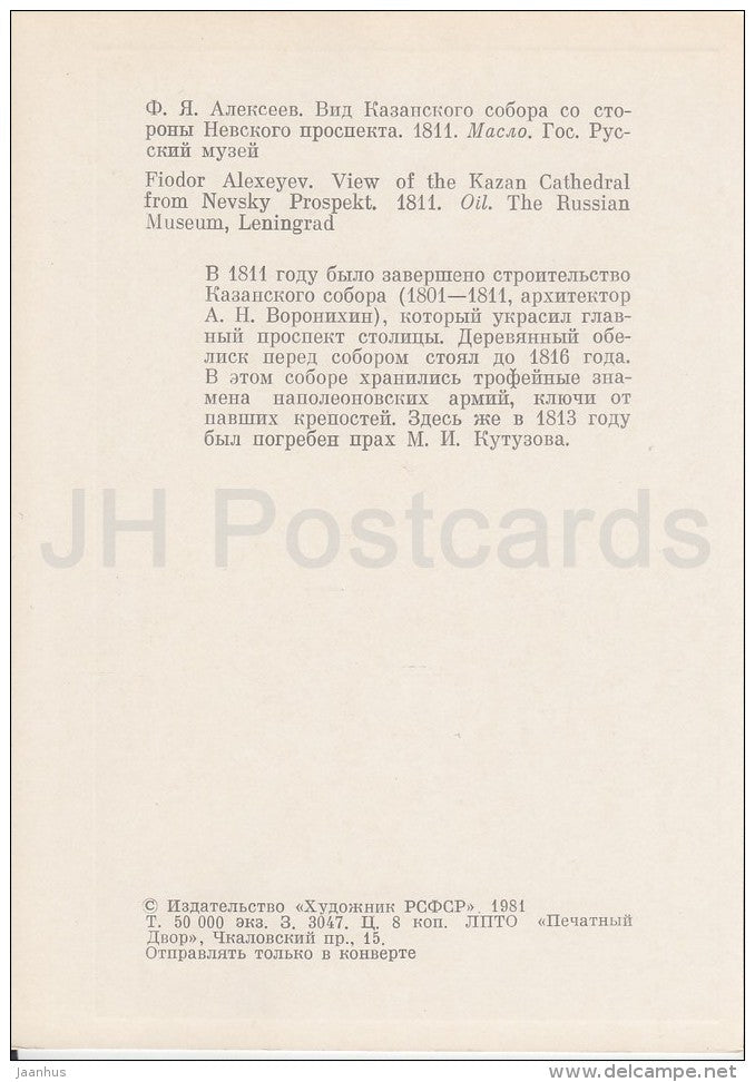 painting by A. Alexeyev - View of the Kazan Cathedral From Nevsky Prospekt - Russian art - Russia USSR - 1981 - unused