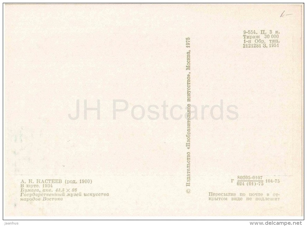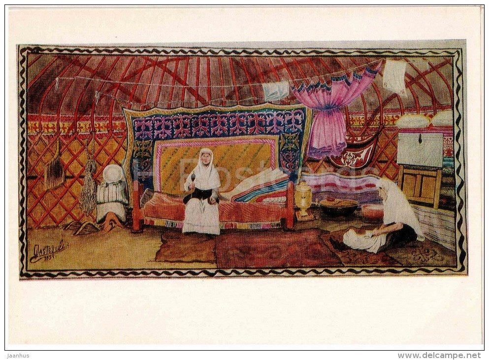 painting by A. Kasteev - Interior of the Yurt , 1934 - bed - kazakh art - unused