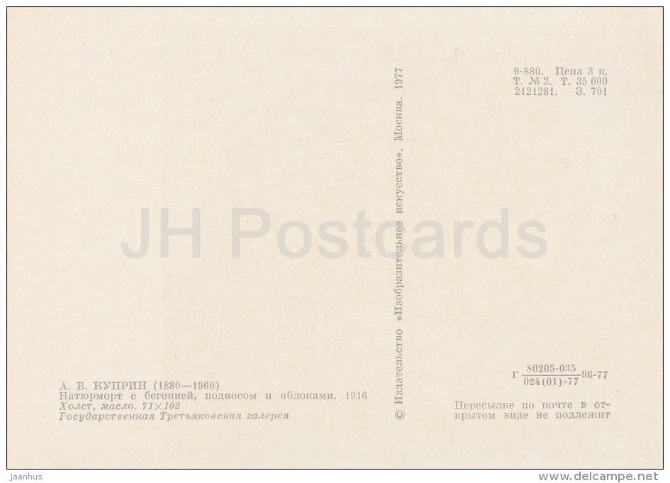 painting by A. Kuprin - Still life with begonias, a tray and apples , 1916 - Russian art - 1977 - Russia USSR - unused