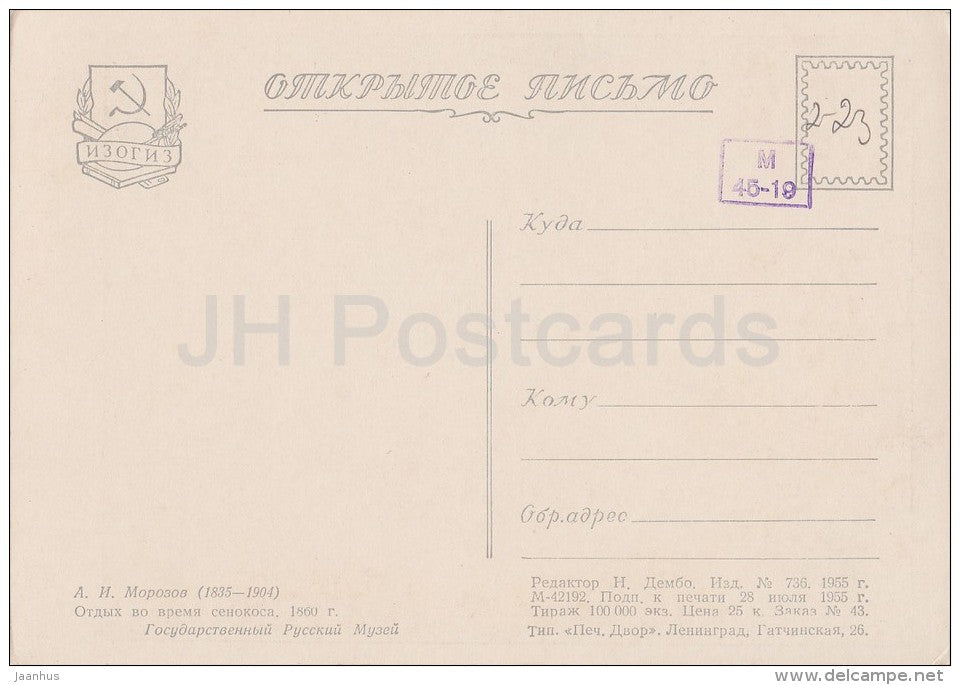painting by A. Morozov - Rest during hay harvest , 1860 - Russian art - 1955 - Russia USSR - unused