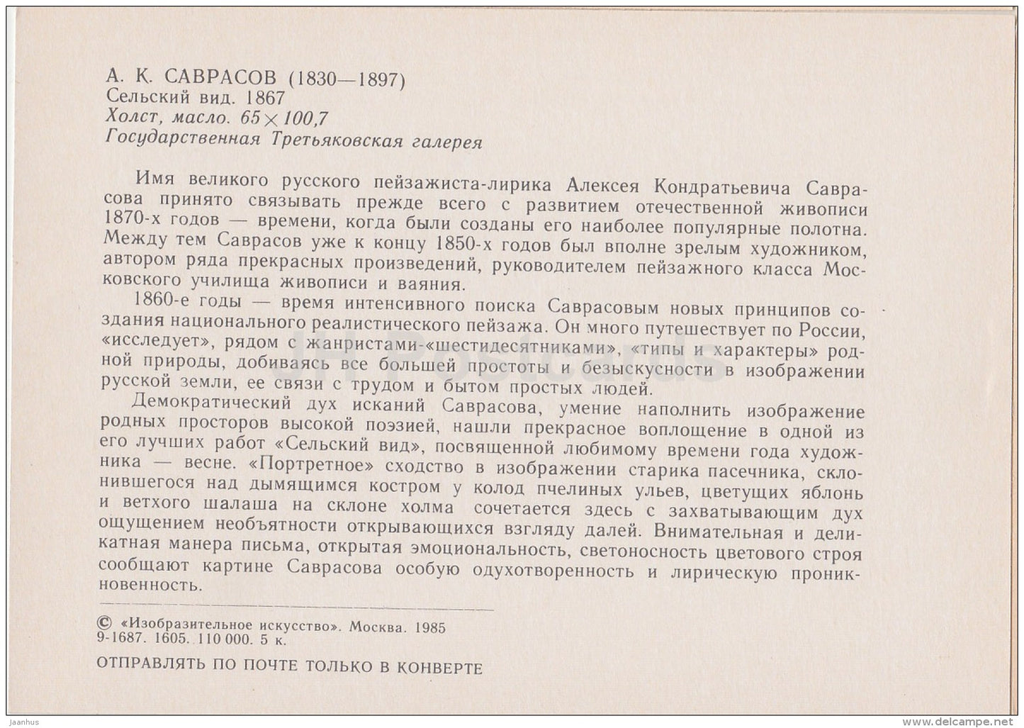painting by A. Savrasov - Rural view , 1867 - Russian art - 1985 - Russia USSR - unused