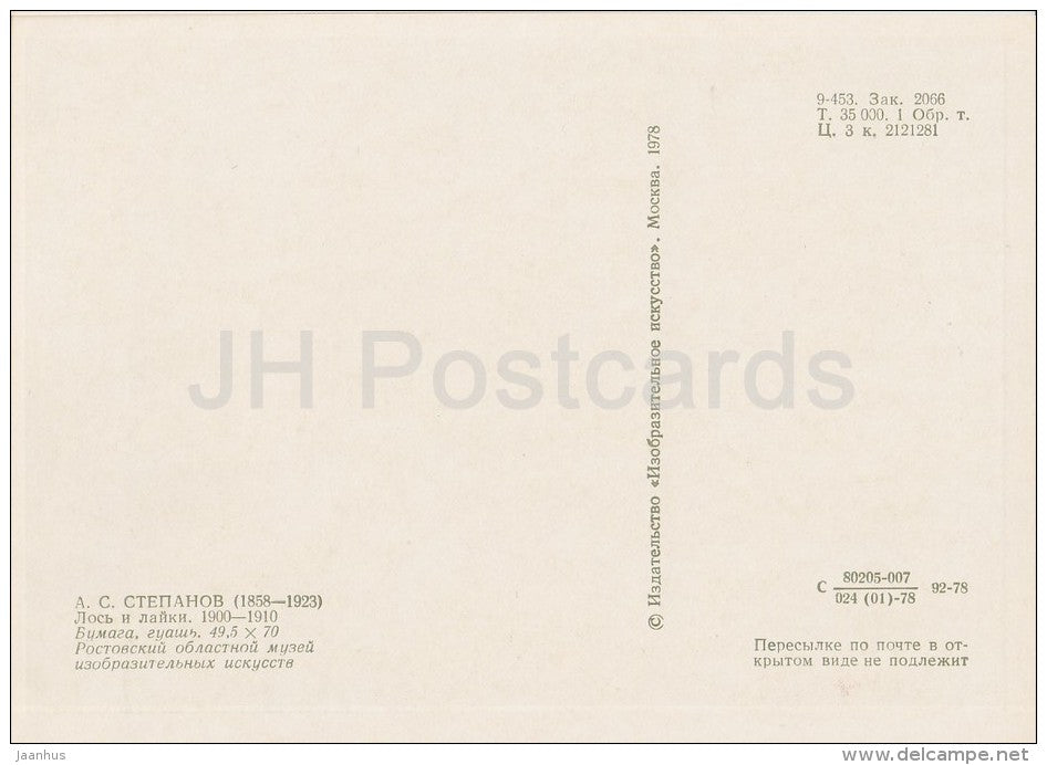 painting by A. Stepanov - Elk and husky - dog - hunt - Russian art - Russia USSR - 1978 - unused