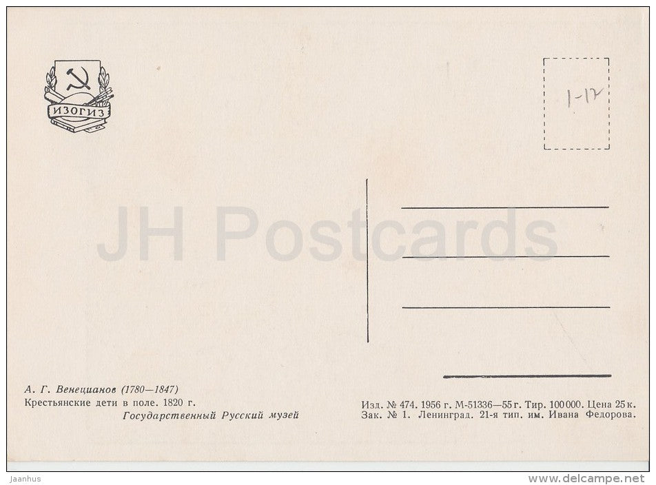 painting by A. Venetsianov - Peasant children in a field , 1820 - Russian art - 1956 - Russia USSR - unused