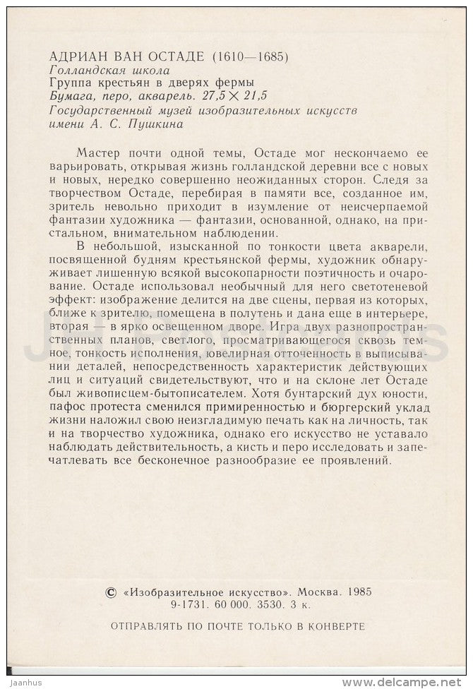 painting by Adriaen van Ostade - A group of peasants at the door of the farm - Dutch art - Russia USSR - 1985 - unused