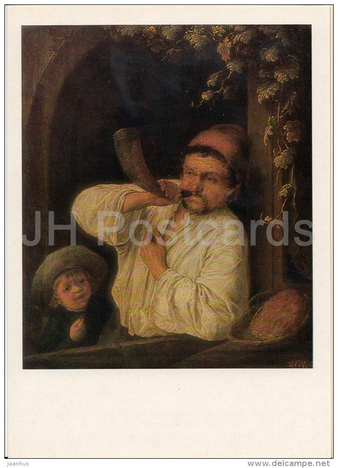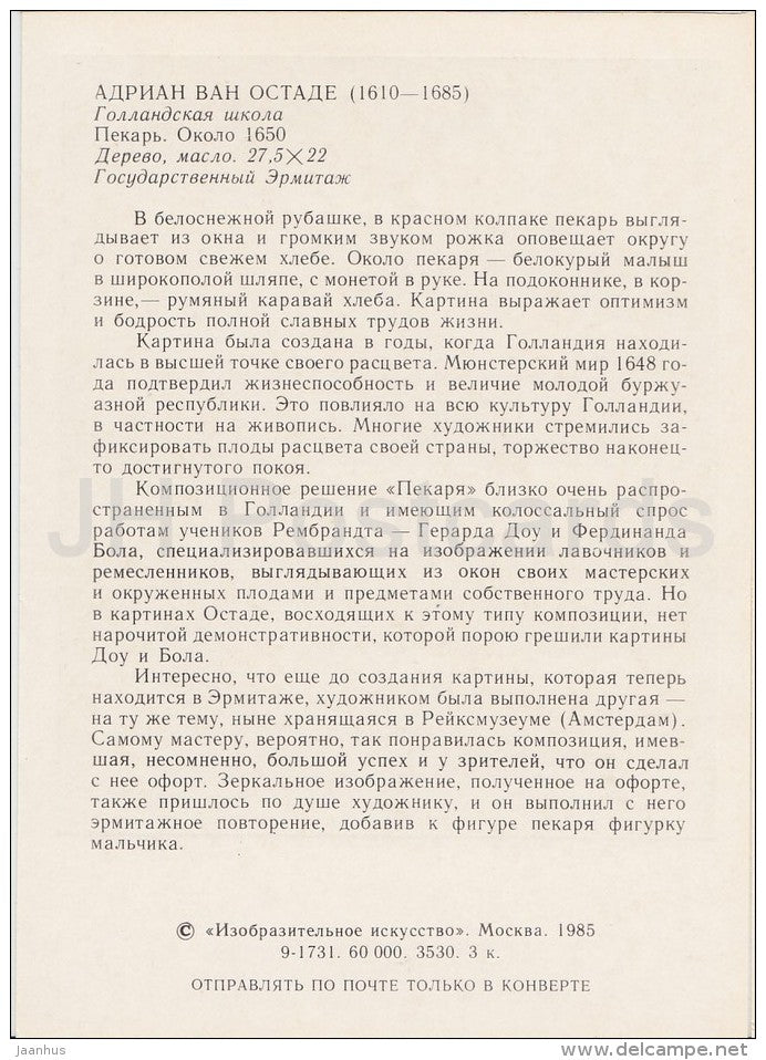 painting by Adriaen van Ostade - Baker , 1650 - horn - Dutch art - Russia USSR - 1985 - unused