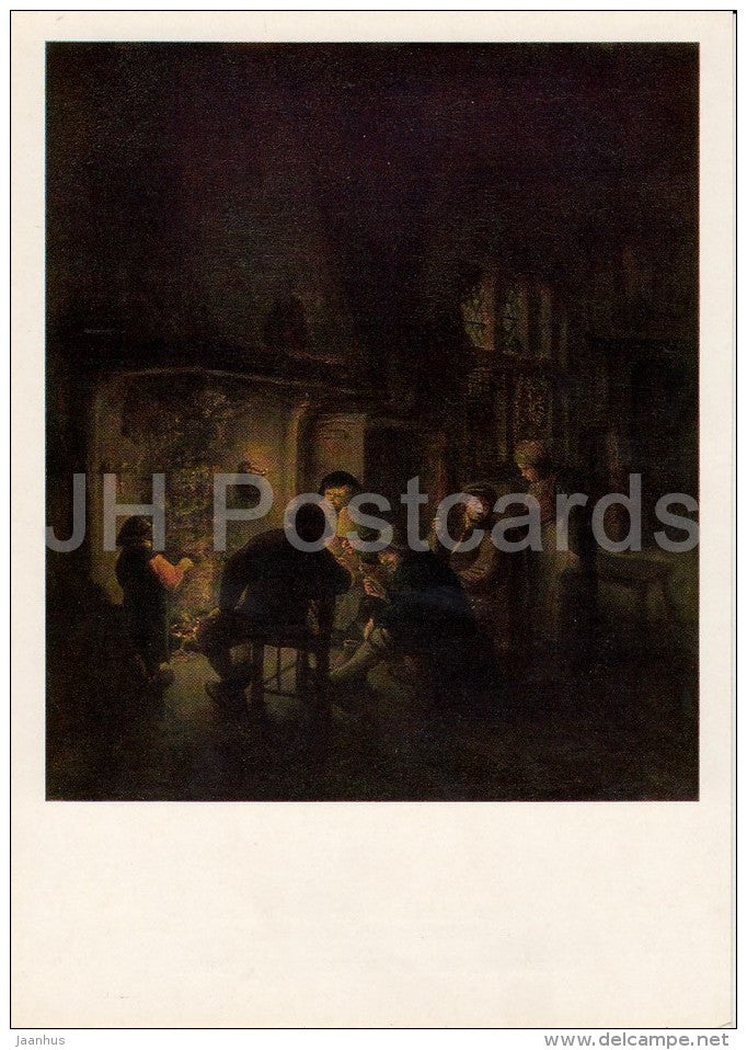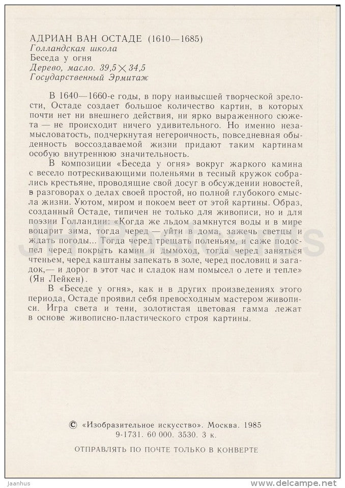 painting by Adriaen van Ostade - Conversation by the fire - Dutch art - Russia USSR - 1985 - unused