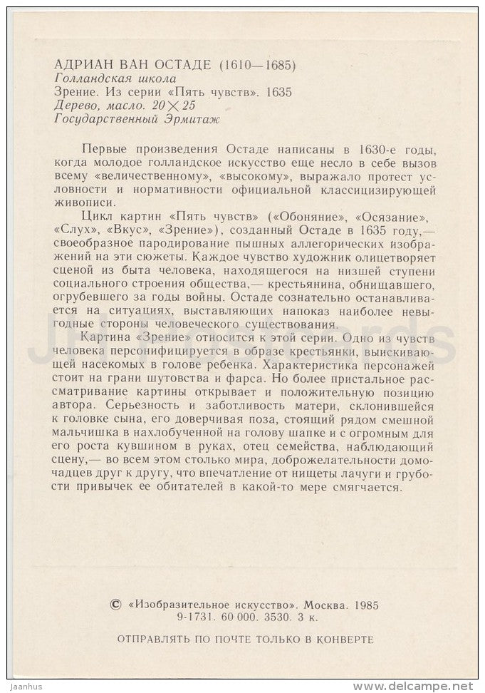 painting by Adriaen van Ostade - Vision . From a series of five senses , 1635 - Dutch art - Russia USSR - 1985 - unused