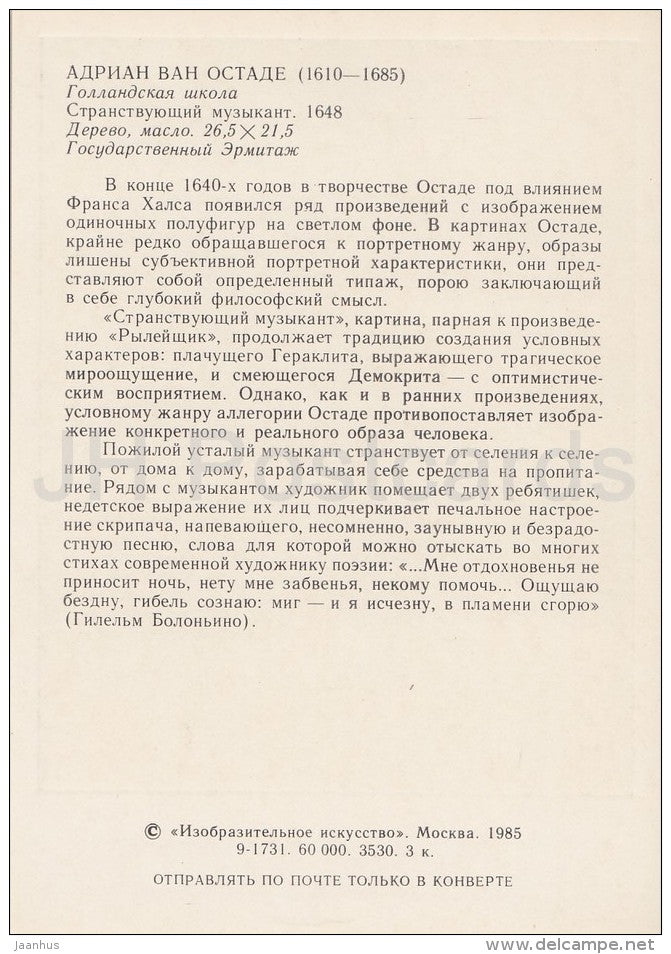 painting by Adriaen van Ostade - Wandering musician , 1648 - violin - Dutch art - Russia USSR - 1985 - unused