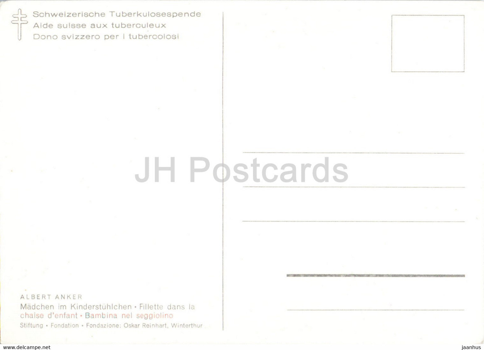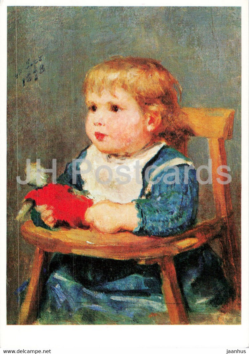 painting by Albert Anker - Madchen mit Kinderstuhlchen - girl - Swiss art - Switzerland - unused