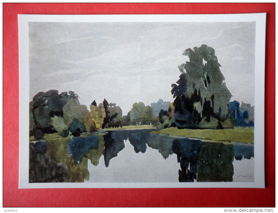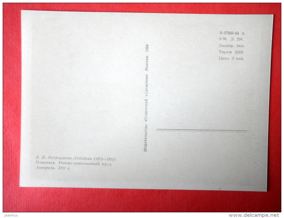 painting by Anna Ostroumova-Lebedeva - Pavlovsk , Pink Pavilion Pond , 1922 - russian art - unused