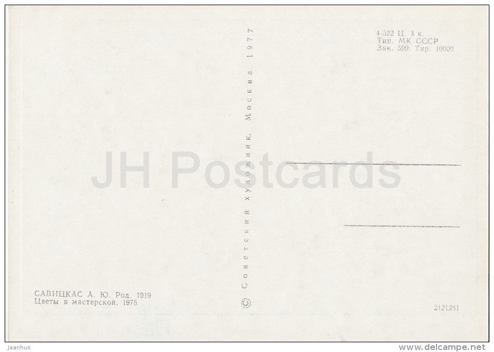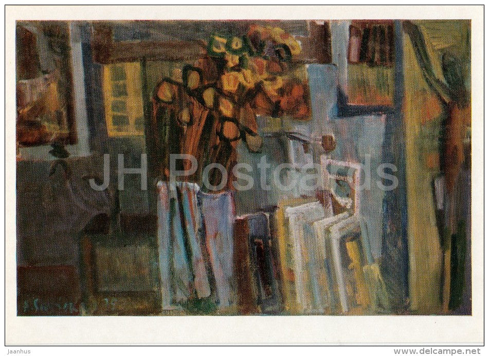 painting by Augustinas Savickas - Flowers in Workshop , 1975 - Lithuanian art - 1977 - Russia USSR - unused