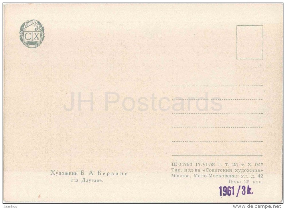 painting by B. Berzins - On Daugava river . Riga - boat - guitar - music - latvian art - unused