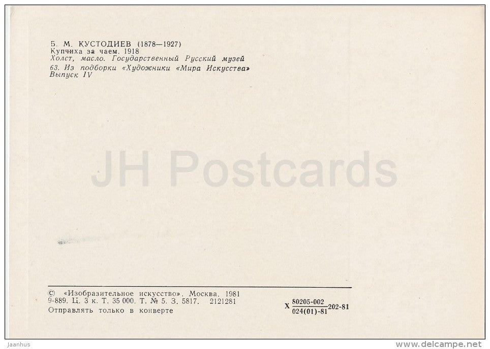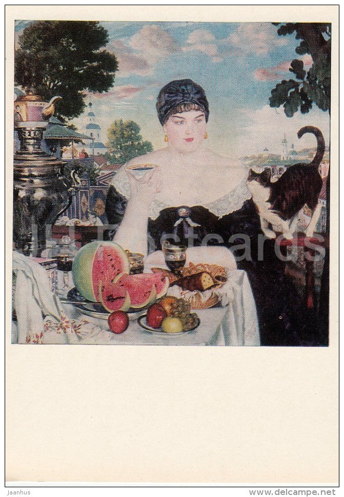 painting by B. Kustodiev - Merchant's wife drinking tea , 1918 - samovar - cat Russian art - Russia USSR - 1981 - unused