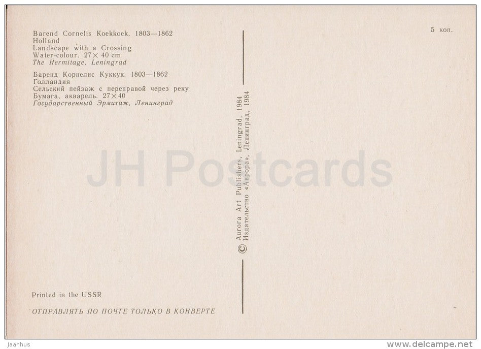 painting by Barend Cornelis Koekkoek - Landscape with a Crossing - boat - Dutch art - Russia USSR - 1984 - unused