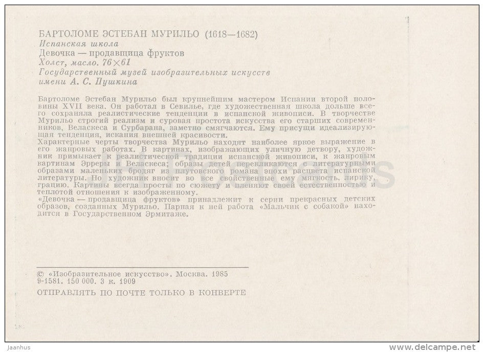 painting by Bartolome Esteban Murillo - Girl - saleswoman of fruits - Spanish art - Russia USSR - 1985 - unused