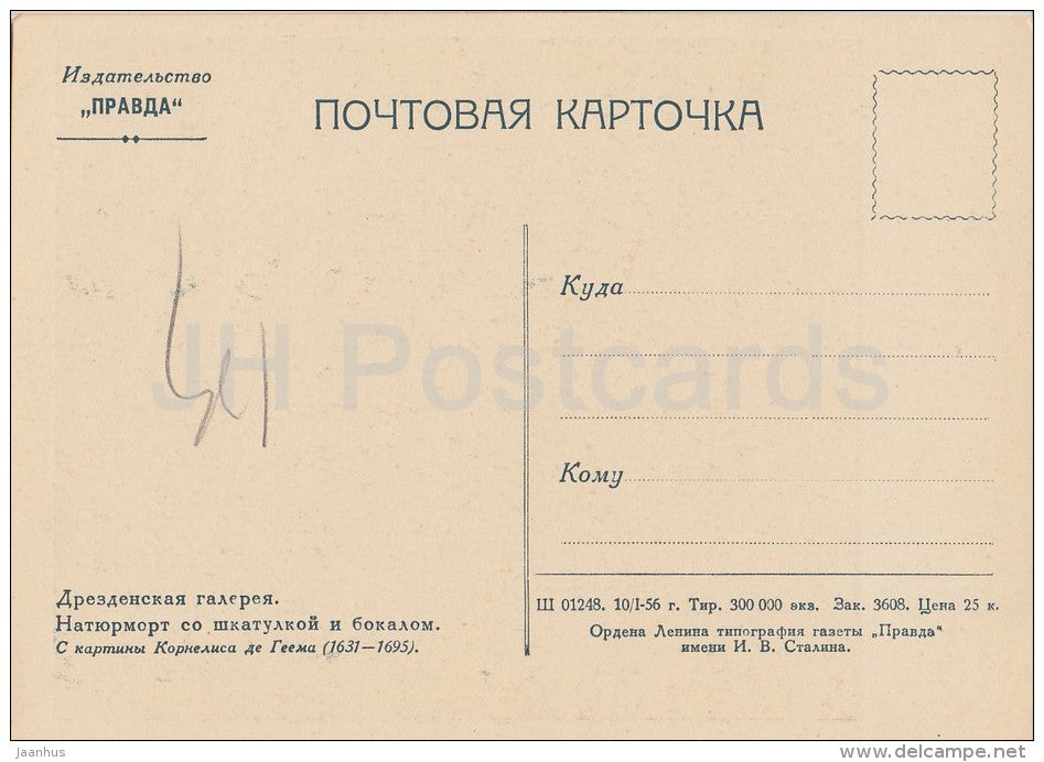 painting by Cornelis de Heem - Still life with a Casket and a Glass - Dutch art - 1956 - Russia USSR - unused