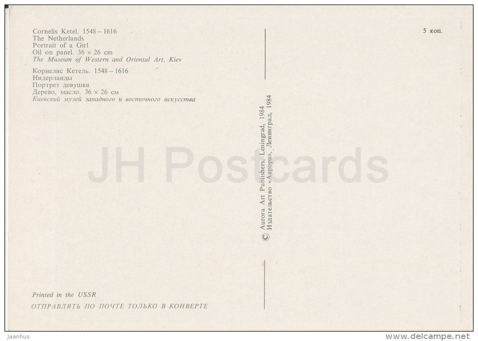 painting by Cornelis Ketel - Portrait of a Girl - hat - Dutch art - Russia USSR - 1984 - unused