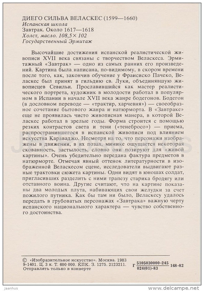 painting by Diego Velazquez - Breakfast , 1617-18 - Spanish art - Russia USSR - 1983 - unused