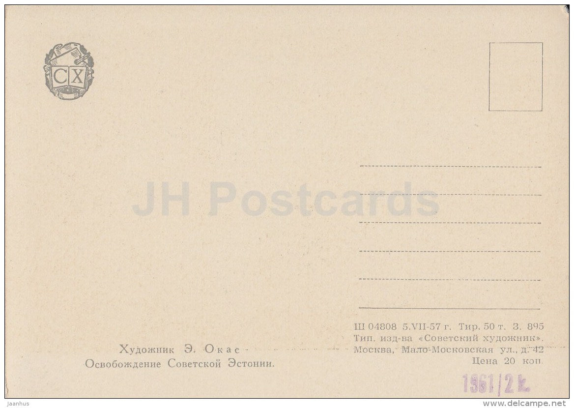 painting by Evald Okas - Liberation of Soviet Estonia - tank - Estonian art - Russia - 1957 - Russia USSR - unused