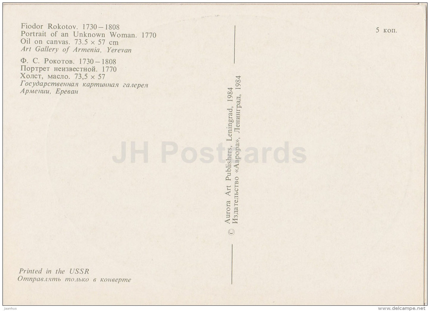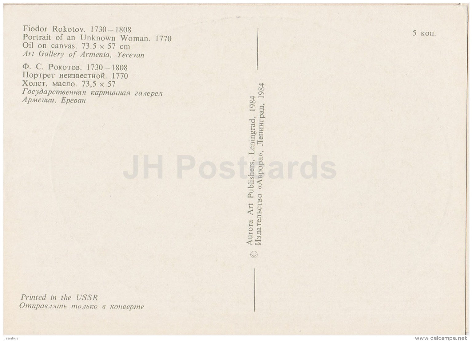 painting by F. Rokotov - Portrait of an Unknown Woman , 1770 - Russian art - 1984 - Russia USSR - unused