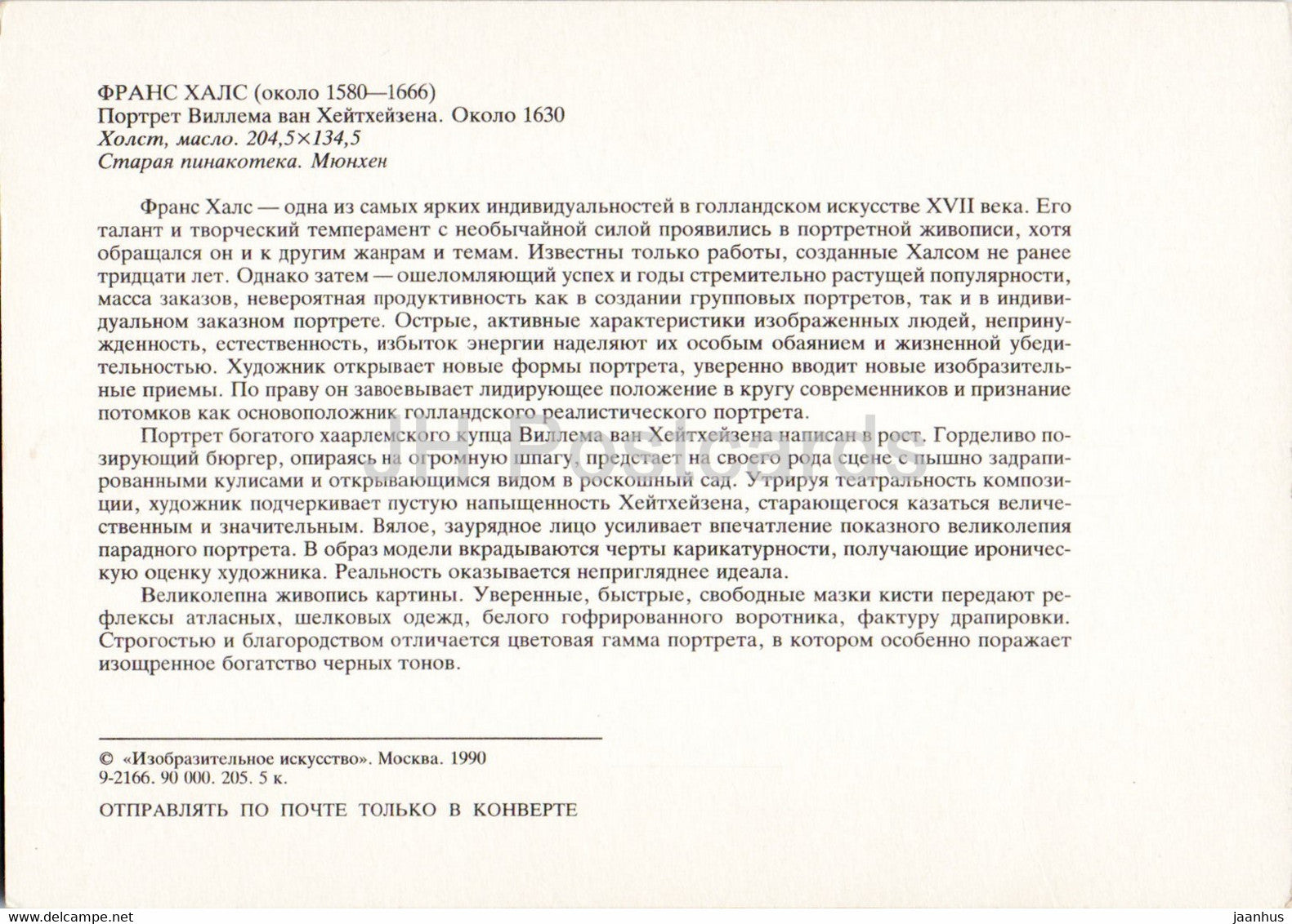 painting by Frans Hals - Willem van Heythuysen Posing with a Sword - Dutch art - 1990 - Russia USSR - unused