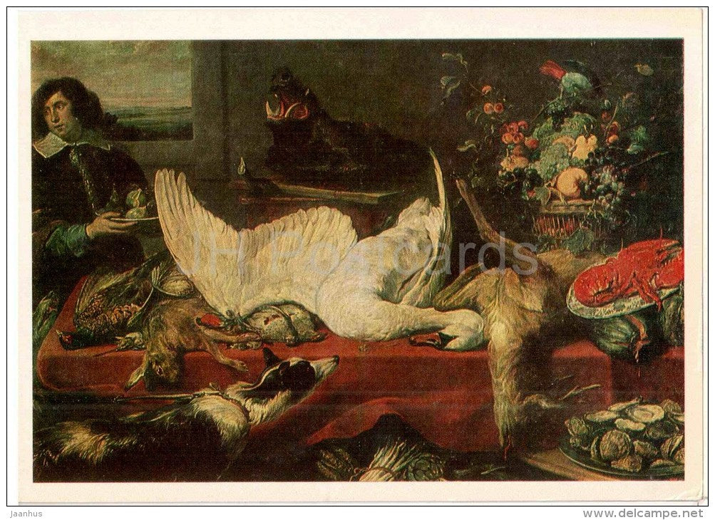 painting by Frans Snyders - Still Life with Swan - dog - hare - deer - wild boar - flemish art - unused