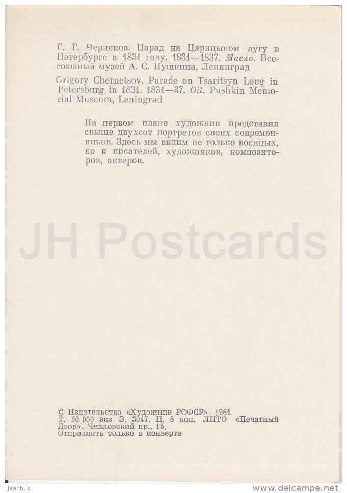 painting by G. Chernetsov - Parade on Tsaritsyn Loug in Petersburg in 1831 - Russian art - Russia USSR - 1981 - unused
