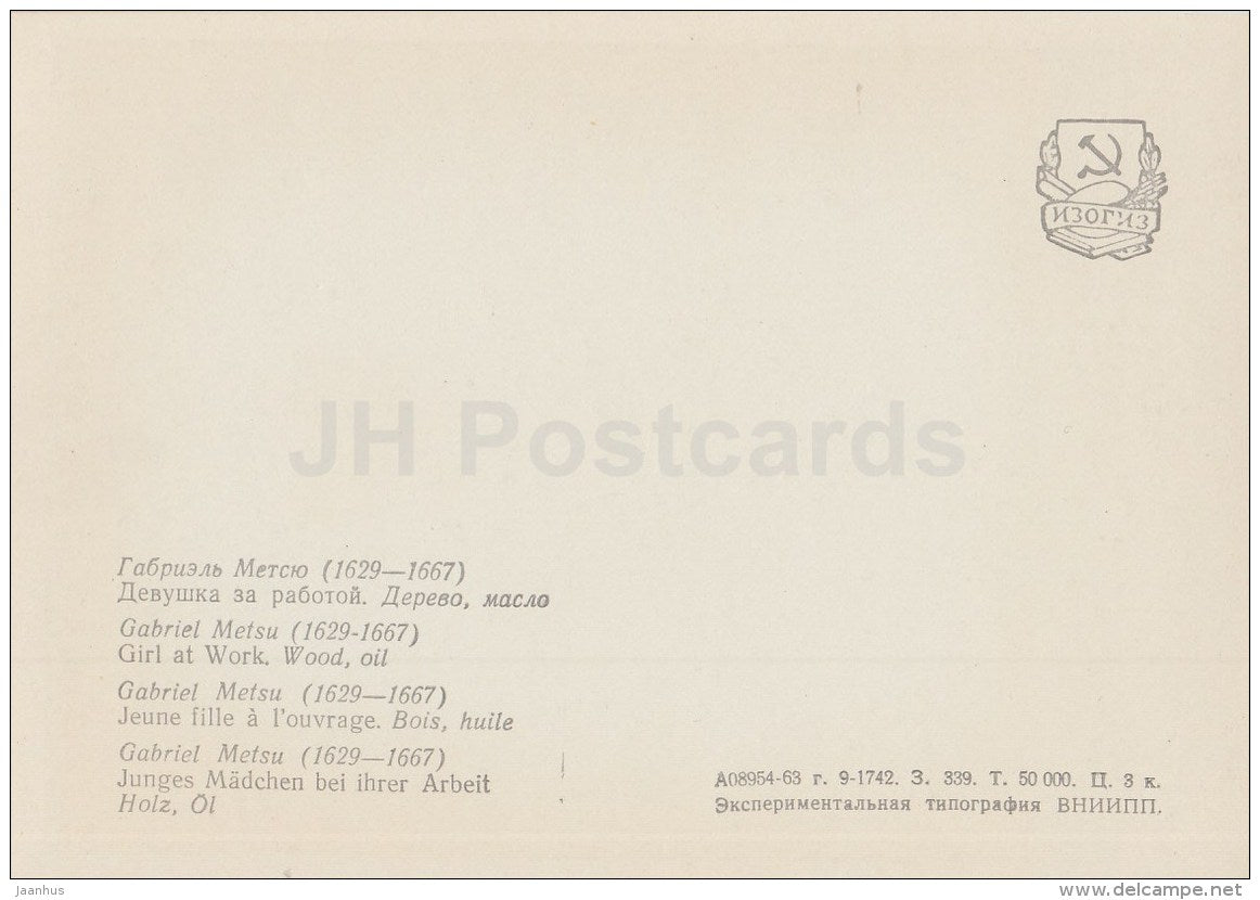 painting by Gabriel Metsu - Girl at Work - birdcage - parrot - Dutch Art - 1963 - Russia USSR - unused