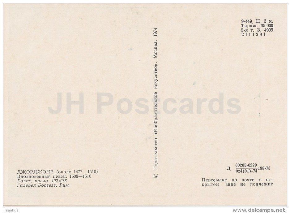 painting by Giorgione - Inspirational singer , 1508-10 - man - hat - Italian art - 1974 - Russia USSR - unused