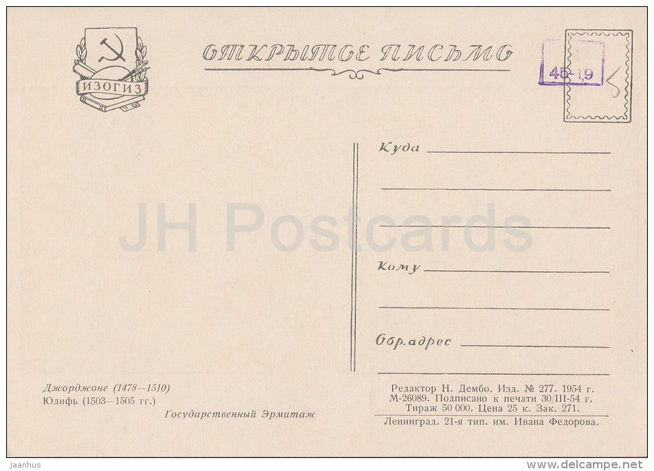painting by Giorgione - Judith , 1503-05 - woman - Italian art - 1954 - Russia USSR - unused