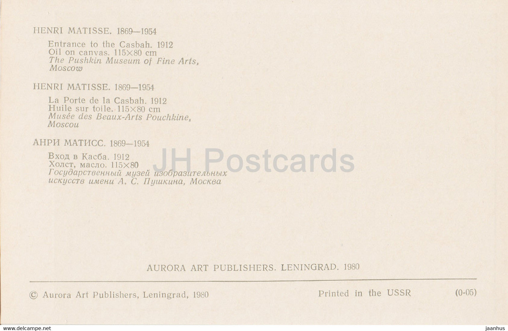 painting by Henri Matisse - Entrance to the Casbah - French art - 1980 - Russia USSR - unused