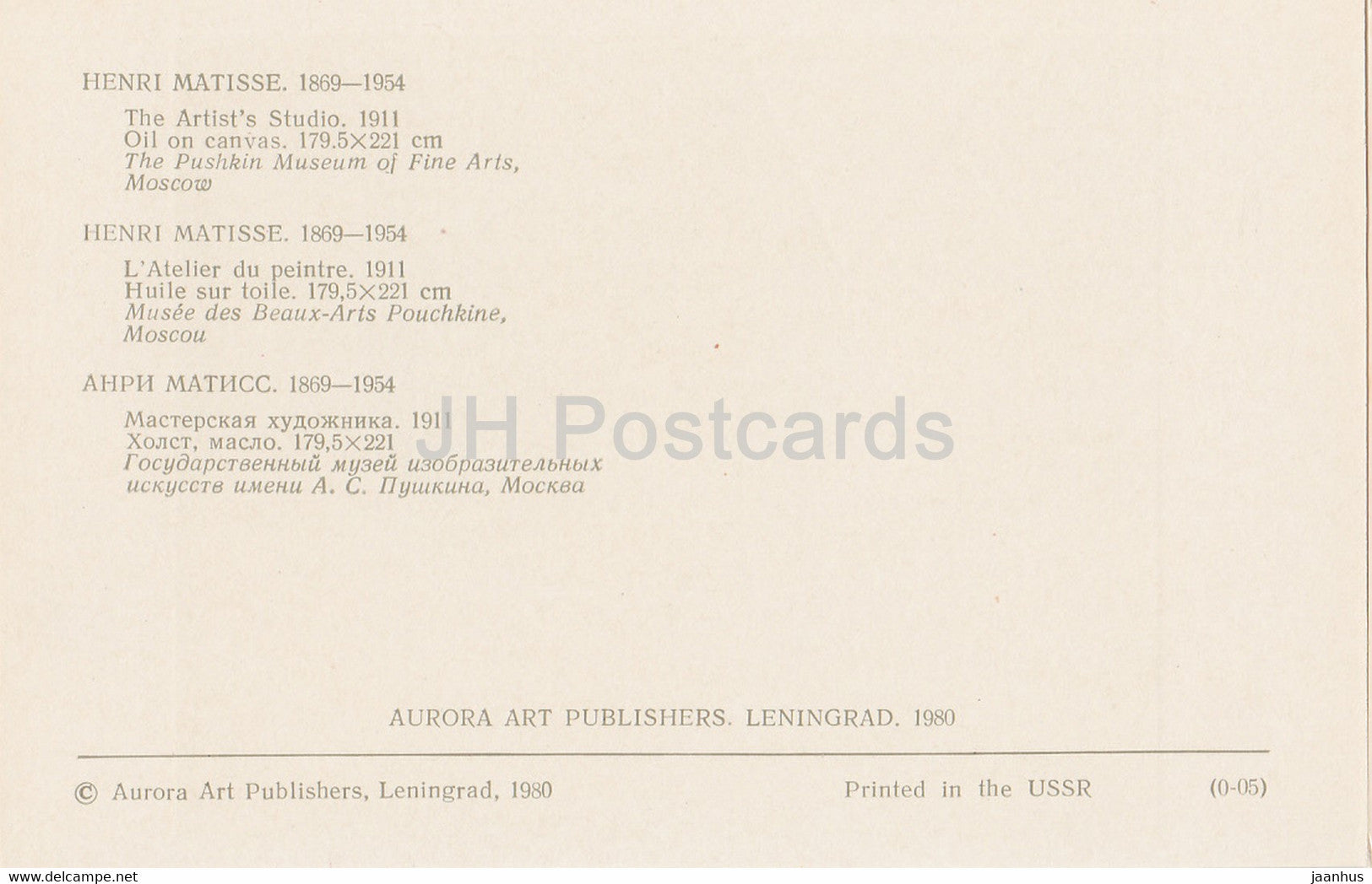 painting by Henri Matisse - The Artist's Studio - French art - 1980 - Russia USSR - unused
