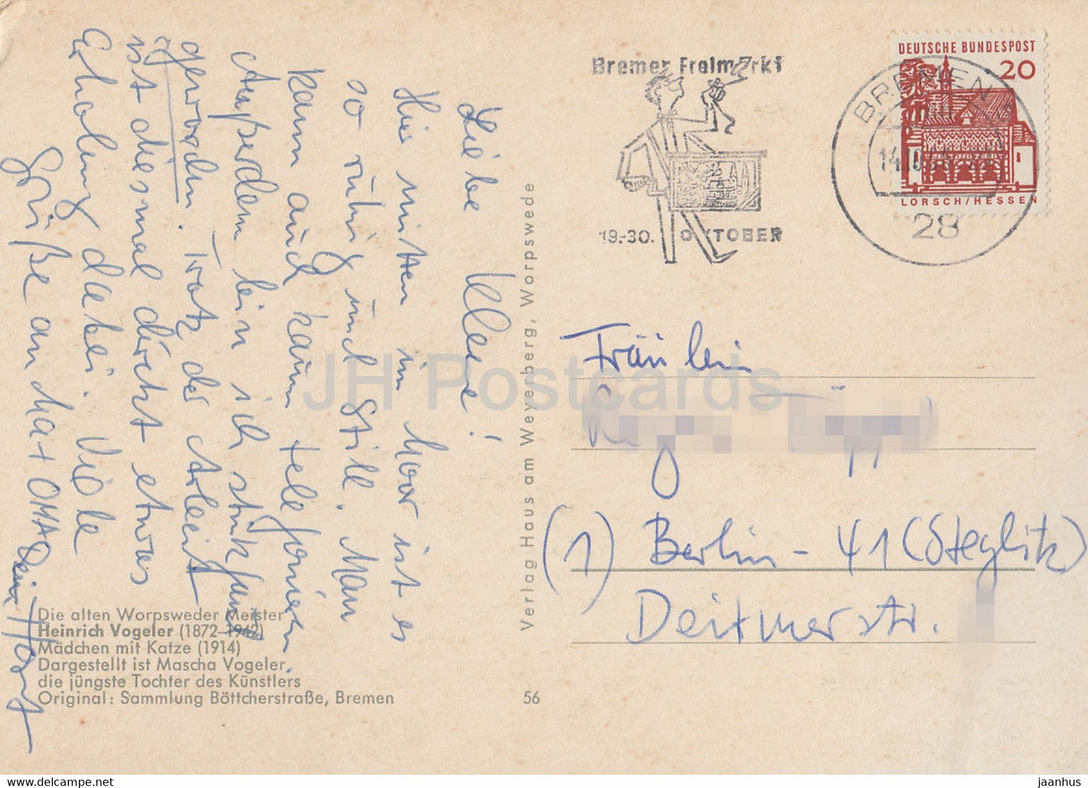 painting by Henrich Vogeler - Madchen mit Katze - German art - Germany - used