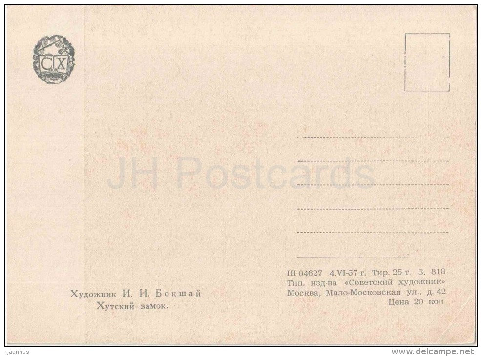 painting by I. Bokshay - Khust Castle - river - mountain - ukrainian art - unused