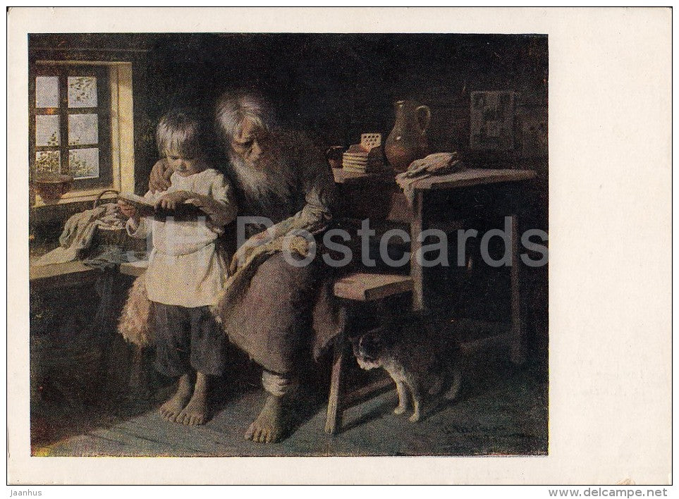 painting by I. Pelevin - Deaf - old man and boy - cat - Russian art - 1951 - Russia USSR - unused