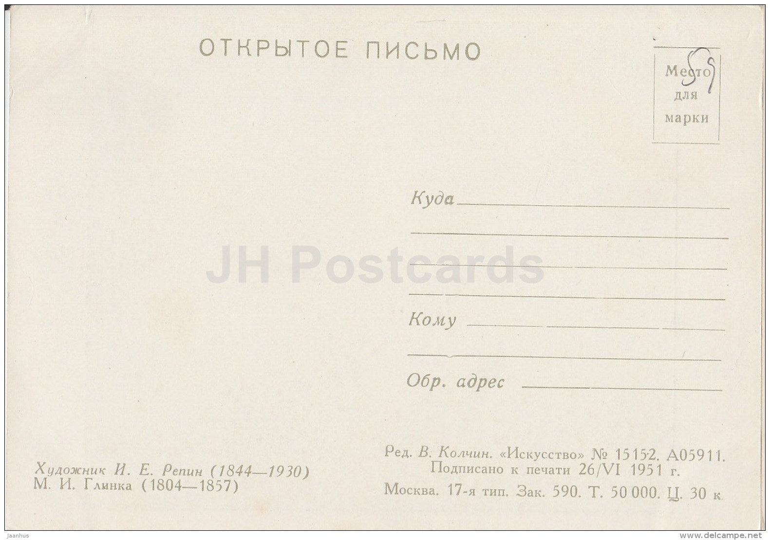 painting by I. Repin - Russian composer M. Glinka - Russian art - 1951 - Russia USSR - unused