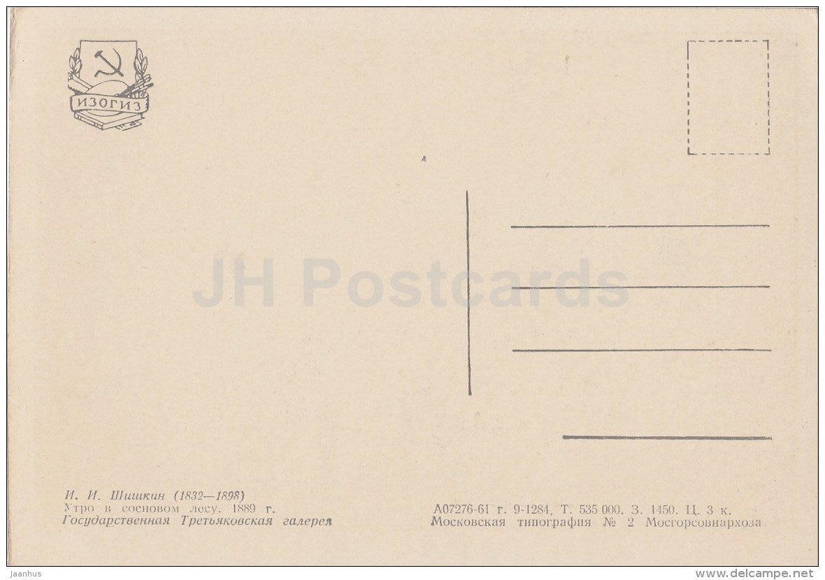 painting by I. Shishkin - 1 Morning in a Pine Forest , 1889 - bear - Russian art - Russia - 1961 - Russia USSR - unused