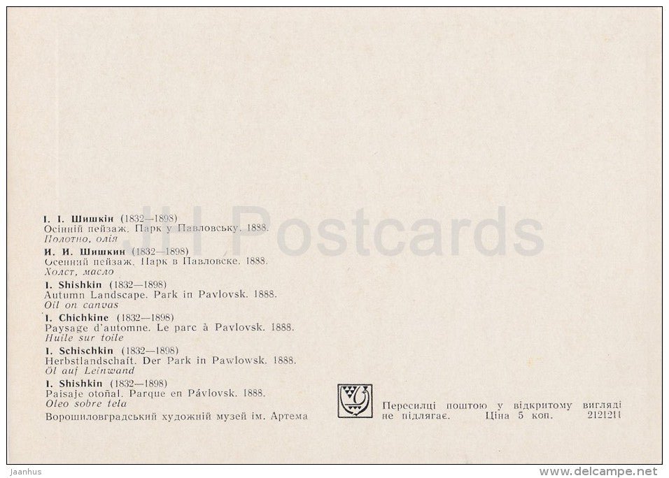 painting by I. Shishkin - Autumn Landscape . Park in Pavlovsk , 1888 - Russian art - 1977 - Russia USSR - unused