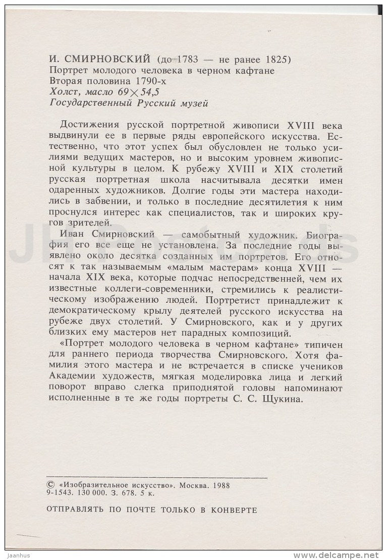 painting by I. Smirnovsky - Portrait of a young man in a black coat , 1790s - Russian art - 1988 - Russia USSR - unused