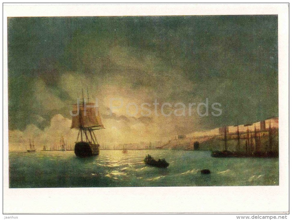 painting by Ivan Aivazovsky - Odessa viewin Moonlight , 1846 - sailing ship - boat - russian art - unused