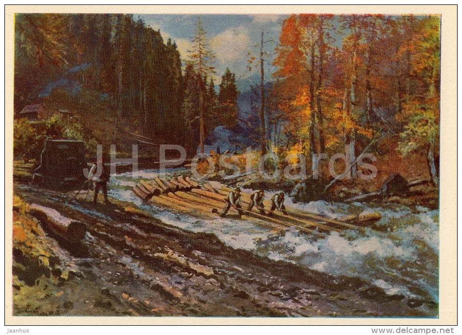 painting by J. Bokshay - A Log Float , 1953 - Ukrainian art - Ukraine USSR - 1964 - unused