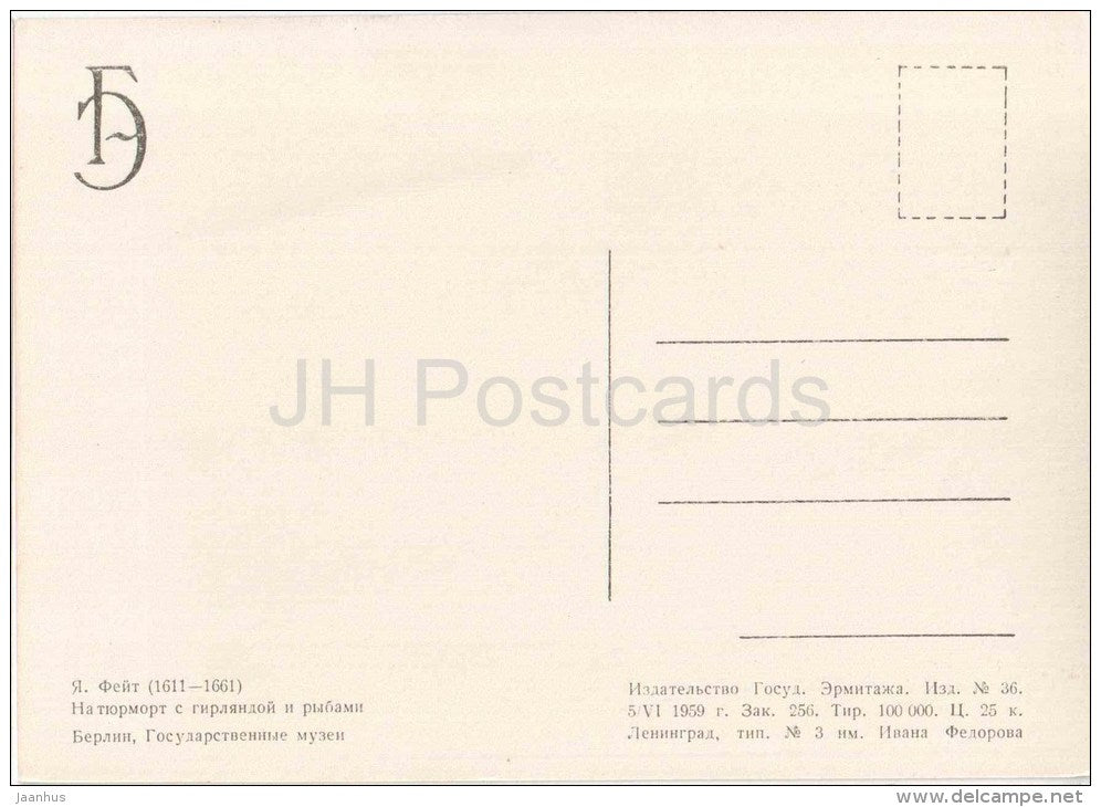 painting by Jan Fyt - Still life with garland and fish - pike - flemish art - unused
