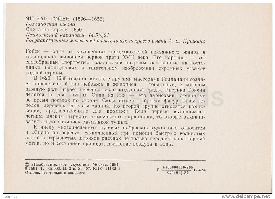 painting by Jan van Goyen - Scene at Embankment , 1650 - Dutch art - Russia USSR - 1984 - unused