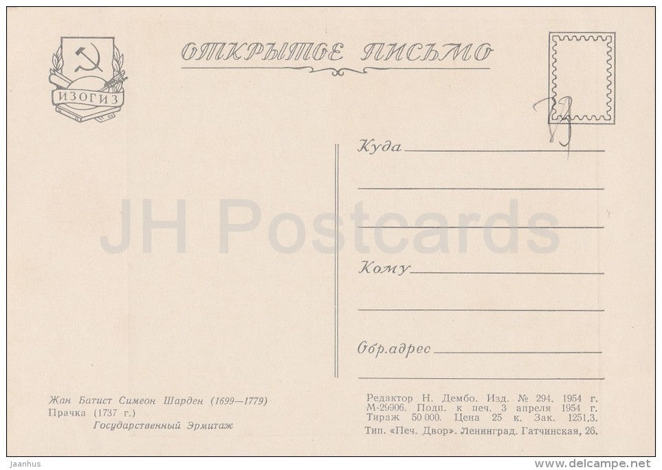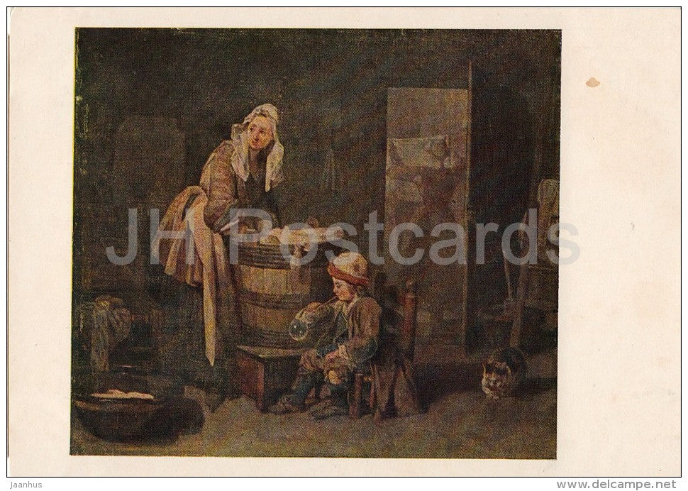 painting by Jean-Baptiste-Simeon Chardin - Laundress - woman - boy - cat - French art - 1954 - Russia USSR - unused