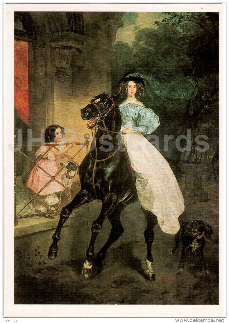painting by K. Bryullov - Horsewoman , 1832 - horse - dog - Russian art - 1985 - Russia USSR - unused