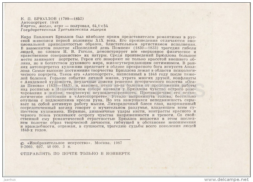 painting by K. Bryullov - Self-Portrait , 1848 - man - Russian art - Russia USSR - 1987 - unused