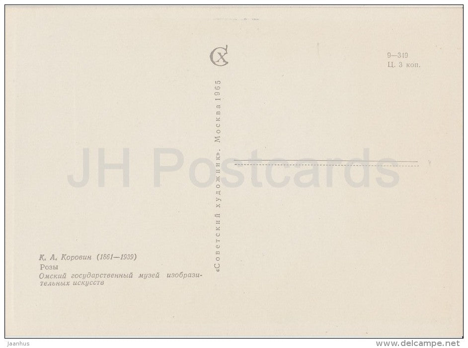painting by K. Korovin - Roses - flowers - vase - Russian art - 1965 - Russia USSR - unused
