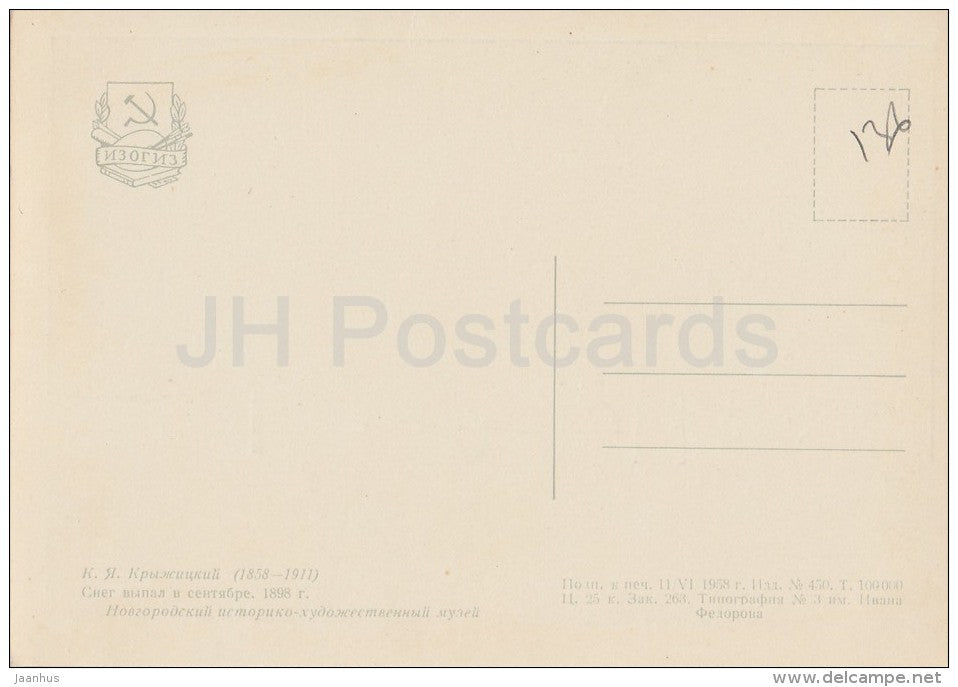 painting by K. Kryzhitsky - Snow fell in September , 1898 - Russian art - 1958 - Russia USSR - unused