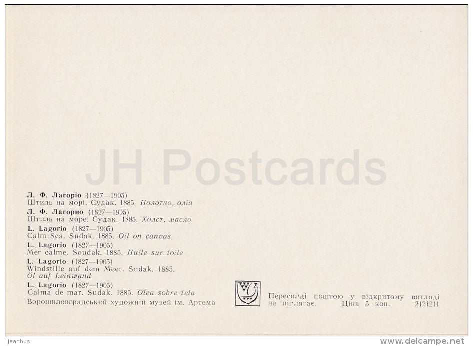 painting by L. Lagorio - Calm Sea . Sudak , 1885 - sailing ship - Russian art - 1977 - Russia USSR - unused