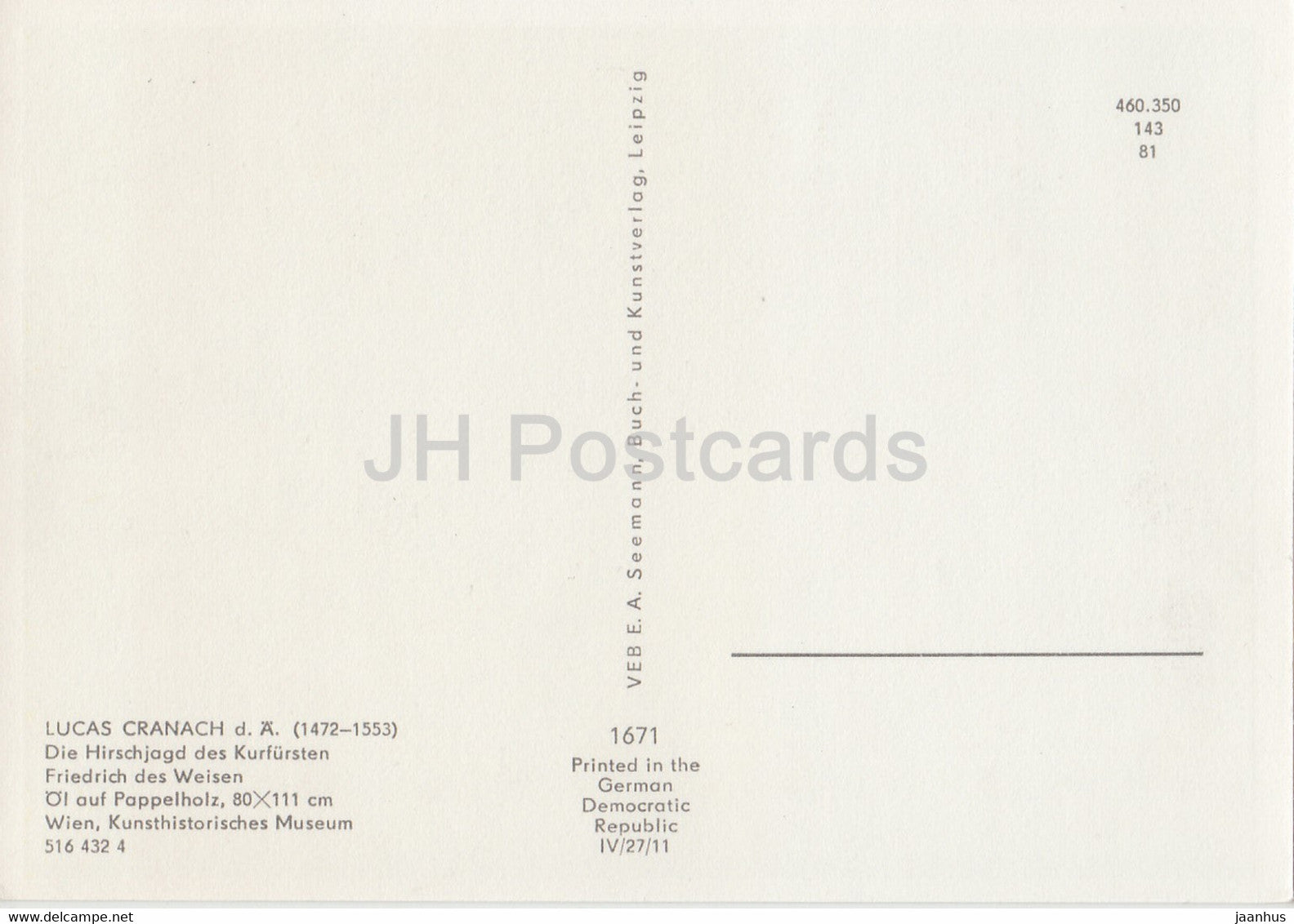 painting by Lucas Cranach the Elder - Die Hirschjagd des Kurfursten Friedrich - 1671 - German art - Germany DDR - unused